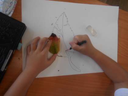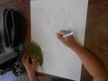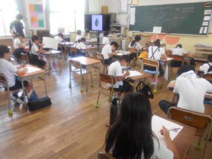 3年1組では図画工作科「み近な しぜんの 形・色」に取り組んでいました。本時では、落ち葉を観察してサインペンで下描きしました。葉の外枠のギザギザ感、所々虫に食われて空いている穴など、自然にできた形を線で表していました。1枚の葉を集中して観察していました。