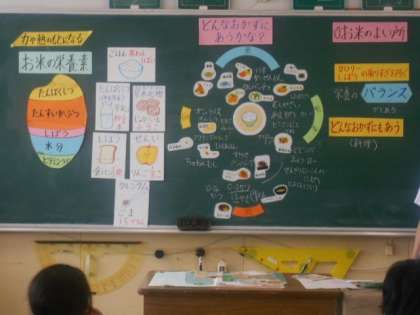 5年1組では食育「私たちの食生活について考えよう」に取り組んでいました。ご飯に合うおかずを出し合うと、結構たくさんあることがわかりました。肉・卵・野菜・魚、取り上げられたどんな副菜にも合うようです。しかも、栄養価を考えると、お米と副菜で体に必要な栄養素を補い合って、全体的にバランスの良い食事になっていることが見えてきました。