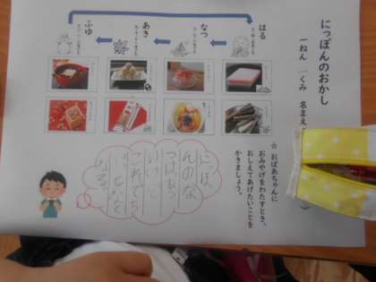 では、今度は、私がおばあちゃんへ「日本に昔から伝わる和菓子のよさ」をお話ししようと思います。学んだことを振り返りながら、ワークシートに書き込んでいました。