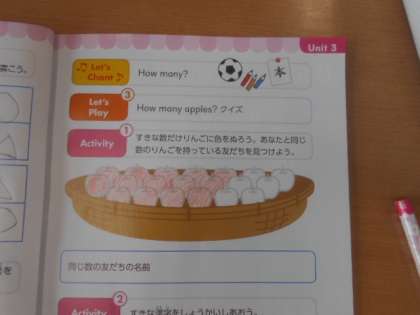 How many? 公開日 2023/09/20 更新日 2023/09/20 3年 3年1組では外国語活動で「How many?」について取り組んでいます。次の絵にあるリンゴをいくつか着色します。そして、「How many apples?」と相手が持っているリンゴの数を尋ねます。まず前で先生らが見本を見せました。うまく受け答えできるようにがんばってほしいです。 いいね(0)