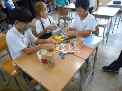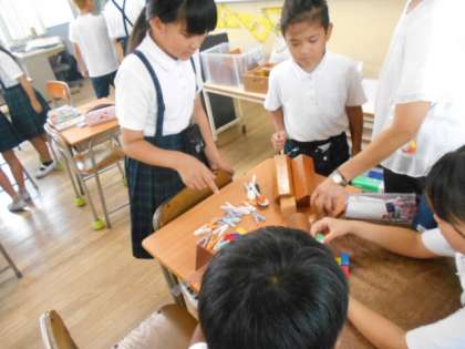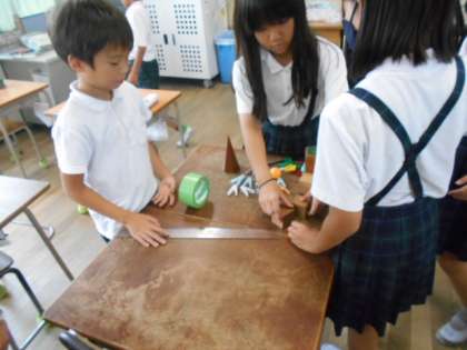いろんな形のものを組み合わせて、どんな転がり方ができるかを考えました。