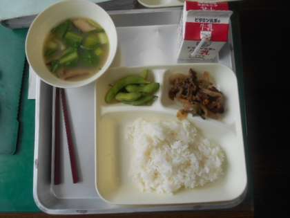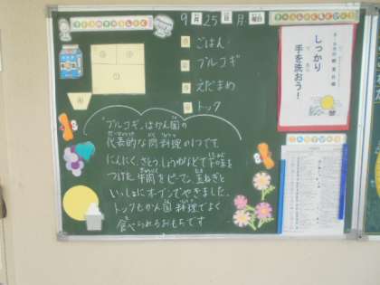 9月25日(月)の給食は、ごはん・牛乳・プルコギ・トック・枝豆です。プルコギとトックは韓国・朝鮮の料理です。プルコギとは焼き肉のことですが、味付けには、しょうが汁・すりおろしにんにく・ごま油などと合わせて、辛みの強いコチジャンを隠し味程度に加えて、子どももおいしく食べられるようにしています。