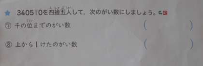 4年1組では算数ドリル上まとめの問題に取り組んでいました。次のような問題が間違いやすいようです。「□の位までのがい数」と「上から□けたのがい数」の違いについて復習していました。