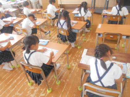 くりかえし かんじドリル 公開日 2023/09/25 更新日 2023/09/25 1年 1年2組では国語科の時間に、くりかえし かんじドリルに取り組み始めました。まずは「ひらがなの れんしゅう」です。絵に合う言葉をマスに書き入れます。次の問題は、「おねいさん」か「おねえさん」そちらか、「家え かえる」か「家へ かえる」どちらかを答えます。ドリルの使い方にも慣れてほしいです。 いいね(0)