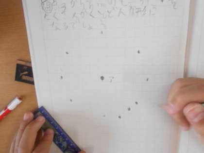 まるい形をしらべよう 公開日 2023/09/26 更新日 2023/09/26 3年 3年2組では算数科「まるい形をしらべよう」を学習していました。課題は、「ノートに点アをとり、点アから5cmのところに点をたくさん描くと、どんな形ができるでしょう。」です。みんな、定規を手に取って、ノートに作業していくと、ある見慣れた形に近づいてきました。 いいね(0)