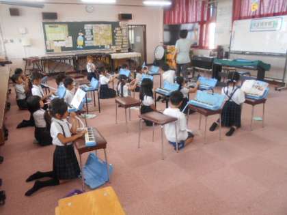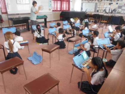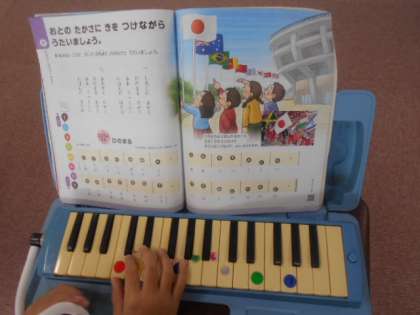 けん盤ハーモニカ 公開日 2023/09/26 更新日 2023/09/26 1年 1年1組では音楽家の時間に、けん盤ハーモニカの練習をしていました。「ドレミ・ミレド・レドレ・ミドミド」を先生の合図に合わせて吹きます。「『ド』は1の指(親指)、『レ』は2の指(人差し指)……。」のように指使いにも気を付けなければいけません。 この後「ひのまる」の演奏につなげていきます。 いいね(0)
