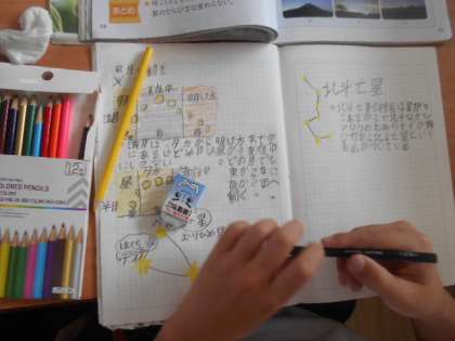 「月のうごき」「星のうごき」まとめ 公開日 2023/10/03 更新日 2023/10/03 4年 4年2組では理科で習った「月のうごき」「星のうごき」についてノートにまとめていました。色鉛筆も活用しながら、見やすくわかりやすくも止まっていました。次は、がんばって作ったまとめのノートを活用して、理科のテストで高得点をとってほしいです。 いいね(0)