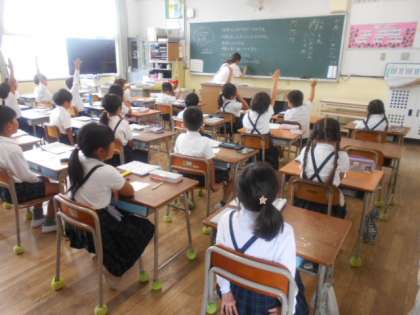 2年生では、学級活動の時間に2学期の目標を考えていました。先生の問いかけにたくさんの児童の手が挙がり「小森先生のお手伝いをがんばる」「目を見て話を聞く」など、やる気に満ちた意見がたくさん出ました。この後、自分で立てた目標をキノコの掲示物に丁寧に清書していました。