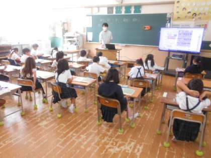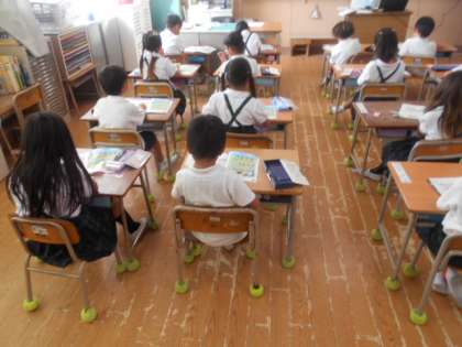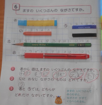 1年2組では算数の時間に、次のような練習問題を解いていました。(1)は、それぞれの鉛筆が「マスのいくつ分の長さですか。」(2)は、「同じ長さのものはどれですか。」と問題が続いています。(3)では、「どちらがどれだけ長いですか。」と2つのことが問われているので、答え方に気をつけていました。