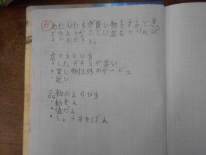 3年1組では社会科の時間、「買い物する時に、どのようなことに気をつけるか。」について話し合っていました。お店の選び方から品物の選び方まで、3年生なりに厳しい消費者の目線で考えていました。