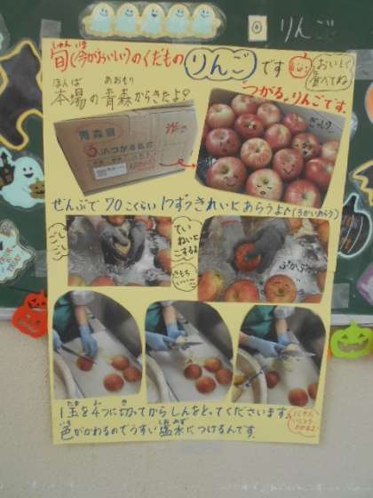 食後のデザートは今が旬の本場青森産「つがる」です。サクサクで甘酸っぱいりんごがついていて、献立のバランスもいいです。次の写真にあるように、調理員さんがりんごを1個ずつ心を込めて丁寧に洗って切ってくださっています。より美味しく感じますね。
