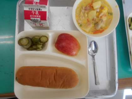 10月6日(金)の給食は、レーズンパン・牛乳・豆乳コーンクリームシチュー(米粉)・きゅうりのバジル風味サラダ・りんごです。