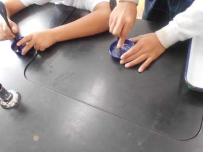 6年生は理科「水溶液の性質とはたらき」を学習しています。前時には、塩酸に鉄やアルミニウムを溶かした時の変化について実験しました。本時では、その液体から出た固体の性質について調べます。色や形、磁石につくのかなどを調べて、ワークシートにまとめていました。