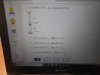 とじこめられた空気と水 公開日 2023/10/06 更新日 2023/10/06 4年 4年1組ではタブレットのデジタルドリルを活用して、理科「とじこめた空気と水」の問題に取り組んでいました。「閉じ込められた空気に外から力を加えると……。」「閉じ込められた水に外から力を加えると……。」実験を思い出して、解いていました。 いいね(0)