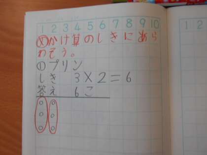 2年生では算数科で、いよいよ「かけ算」に入っていました。「1枚のお皿にプリンが2個のっていて、そのお皿が2枚あるとき、プリンは全部でいくつありますか。」という問題です。図に描いて、数えたり3跳びで考えたりしながら答えを導いていました。では、「1枚のお皿にプリンが2つのっていて、そのお皿が3枚あるときプリン全部の数はいくつでしょう。」式を立てられたでしょうか。