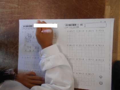 十の位でくりあがり 公開日 2023/10/16 更新日 2023/10/16 3年 3年1組では算数科「かけ算のひっ算1」の練習プリントに取り組んでいました。2ケタ×1ケタの筆算ですが、かけ算した後、たし算をする段階で、十の位がくり上がるようです。手順を間違えないように、慎重に計算していました。 いいね(0)