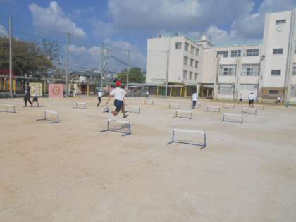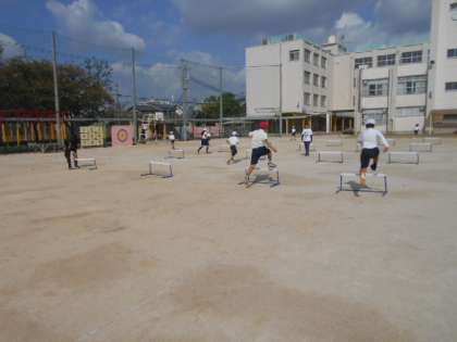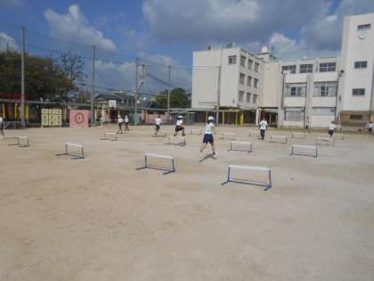 ハードル走 公開日 2023/10/17 更新日 2023/10/17 5年 5年生は体育科で「ハードル走」に取り組んでいました。4コースあって、並んでいるハードルの間隔が各コースで異なっています。自分の歩幅に合ったコースを見つけて、低い姿勢で跳べるように、何度も練習していました。 いいね(0)