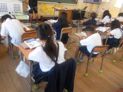 4年2組では社会科で大阪の代表的な祭り、天神祭りについて学習をしています。本時では、天神祭りのようすについて調べます。「ほこ流神事」「ししまい」など、難しい言やなじみの薄い言葉を取り上げ、タブレットや教科書、資料集で調べていきました。