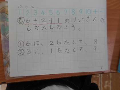 ふえたり へったり 公開日 2023/10/17 更新日 2023/10/17 1年 1年1組では算数科「ふえたり へったり」を学習していました。 本時では「6+2+1」の計算手順をノートにまとめていました。(1)「6に 2をたして、8」そして、(2)「8に 1をたして、……」手順を確認して、早く正確に計算できるようにがんばってほしいです。 いいね(0)