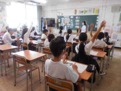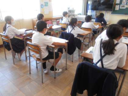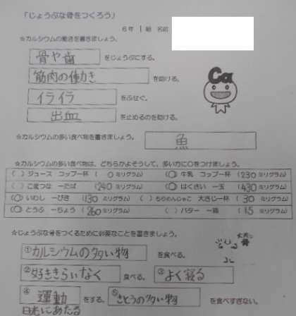 6年生は食育「じょうぶな骨をつくろう」に取り組みました。カルシウムは広く知られている栄養素で、その働きや多く含まれえる食材についても、児童は意外によくわかっているようでした。次に「生活の中で丈夫な骨を作るために必要なことは?」と問われ、いろいろな意見が出てワークシートに書き込みました。