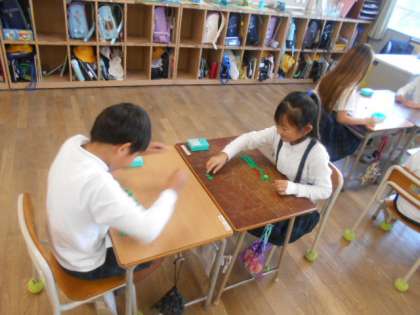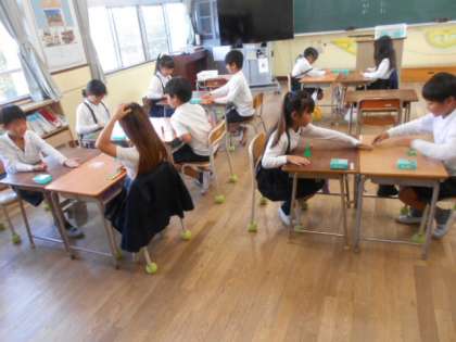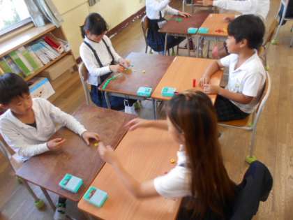10個で1点ゲーム 公開日 2023/10/26 更新日 2023/10/26 3年 3年2組では算数科の時間に「10個で1点ゲーム」をしていました。1人25個おはじきを持ってジャンケンをして、勝った方がおはじきをもらいます。 3分後得点を集計します。おはじきは「10個で1点」です。おはじきを39個持っていたら何点になるでしょうか。ここで、「小数」の仕組みに着目します。 いいね(0)