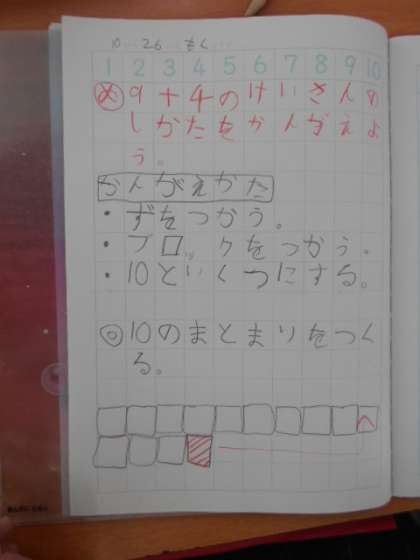 くり上がりのあるたし算 公開日 2023/10/26 更新日 2023/10/26 1年 1年2組では算数科で、くり上がりのあるたし算を学習しています。「9+4」の計算の仕方を考えます。解き方の見通しも数通り出ていました。ノートにタイル図を描いて、「4の中から1を9へ動かして……。」このように、10のかたまりを作られるように工夫していました。 いいね(0)