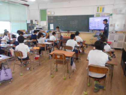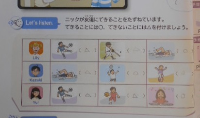 He can run fast. She can do kendama. 公開日 2023/11/01 更新日 2023/11/01 5年 5年2組では英語科「He can run fast. She can do kendama.」の学習をしています。「Can you 〇〇.」「Yes,I can.」「No,I can’t.」の受け答えをヒアリングして、次の絵に〇や△をつけていきます。正確に聞き取ることができたでしょうか。 いいね(0)