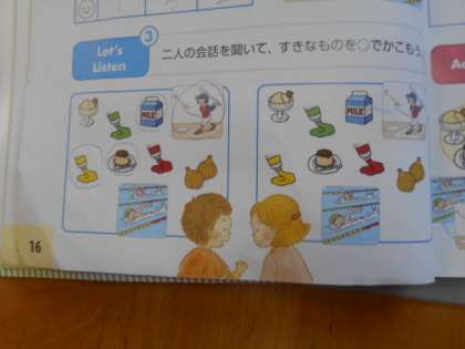 次は、ヒアリングです。「I like baseball.」「I don’t like milk.」などの会話を聴き取って、あてはまる絵に〇をつけていきます。正しく聴き取れたでしょうか。