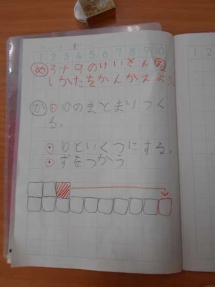 3+9 公開日 2023/11/01 更新日 2023/11/01 1年 1年2組では算数科の時間に「3+9」の計算の仕方について考えていました。ノートに3個と9個のタイルをかいて、タイルの操作を赤い矢印で書き込みます。10のかたまりを作るのに、より簡単な操作を見つけられたでしょうか。 いいね(0)