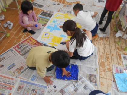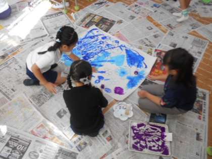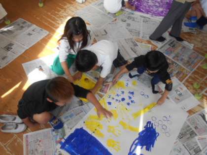 1年1組では図画工作科「ぺったん コロコロ」に取り組んでいました。スタンプや綿棒、ローラーなどを使って、班で協力して自由に絵を描いていきます。手形をつける児童もいました。遊び心いっぱいで、楽しい共同作品ができ上がっていきました。