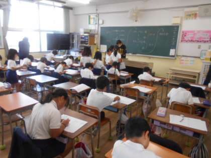2年生が算数科の時間に「かけ座」練習プリントに取り組んでいました。1・2枚目は2の段から5の段までの計算問題、3・4枚目は文章問題です。九九を忘れてしまった場合は、教室横に貼ってある九九の表をヒントに解いていました。