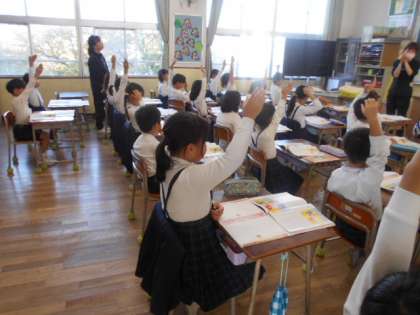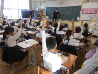 2年生は道徳科「くりの み」に取り組んでいました。きつねとうさぎは、くりの実を探していました。きつねは、くりの実をたくさん見つけました。お腹いっぱい食べた後、独り占めしたくて残りを隠しました。その後、きつねは、うさぎに会って「全然取れなかった。」と噓をつくと、うさぎは2つしか取れなかったうちの1つをきつねに手渡しました。