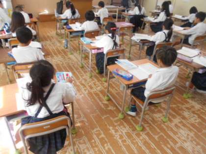 はっけんしたよ 公開日 2023/11/07 更新日 2023/11/07 1年 1年1組では国語科「はっけんしたよ」を学習していました。周りの花や木、生き物について、文章に書いて紹介します。教科書の手本をノートに視写していました。原稿用紙の使い方を確認しながら、先生と一緒に書き進めていました。正確に書けたでしょうか。 いいね(0)