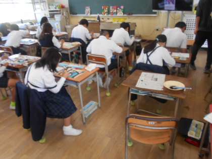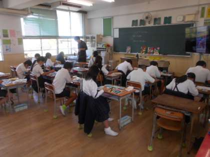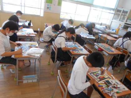 うきうきネームパズル 公開日 2023/11/08 更新日 2023/11/08 5年 5年1組では図画工作科「うきうきネームパズル」に取り生んでいました。何本もの線が描かれた模様の中に、自分の名前がアルファベットになって隠れています。何と書かれているか読もうとしても、複雑ですぐに分からない作品ばかりです。 この後、板を切ってパズルにします。楽しいパズルのように、うまく切ってほしいです。 いいね(0)