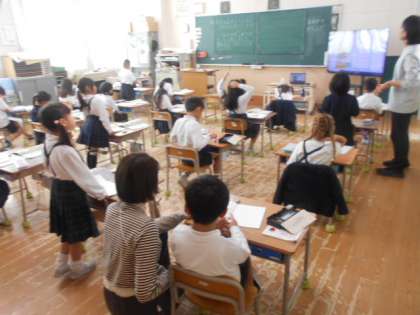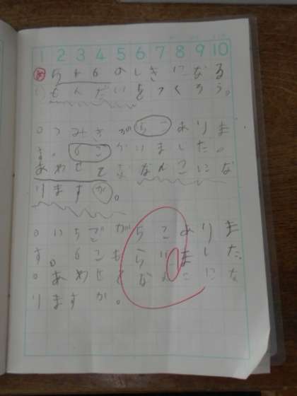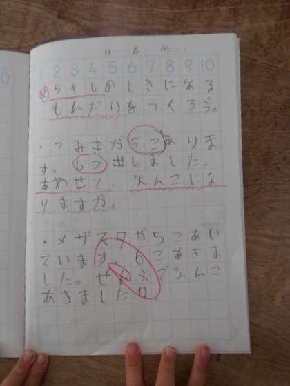 1年1組で算数科の時間に「5+6のもんだいづくり」に取り組んでいました。「5こ」「5人」など単位に気をつけたり、「あわせて なんこに なるでしょう」のように問いの文章にしたり、問題作りは少々難しいようですが、問題を作られた児童からがんばって発表していました。
