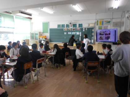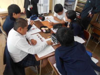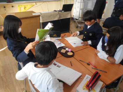 5年1組では国語科「和の文化を受け継ぐ—和菓子をさぐる」を学習していました。和菓子の定義や説明文に出てくる和菓子の種類を読み取ってから、写真資料に出てくる和菓子の材料や作り方について、食育を兼ねて栄養職員の先生から詳しく話を聞き、自分たちでも考えてみました。実際に和菓子屋から実物を取り寄せて、実物を見ながら考えました。