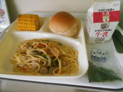 スパゲッティは、ウインナーやベーコン、きのこなどの具材がたっぷりで、ボリュームがあります。和風の味付けで、添付のきざみのりとも相性抜群です。
