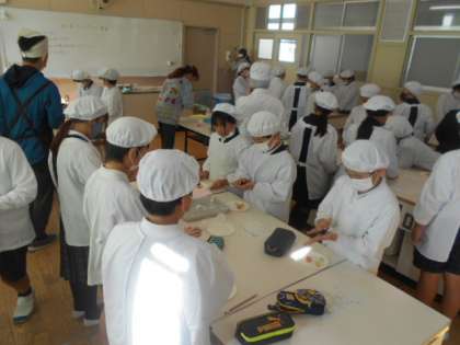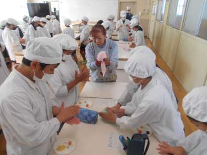 5年生では「和菓子をつくろう」に取り組んでいました。国語科で「和の文化を受け継ぐ〜和菓子をさぐる〜」を学習しています。実際に和菓子作りを体験することで、読み取ったことをより感じることができるでしょうか。まず、餡玉(あんたま)を丸めるところから始めています。
