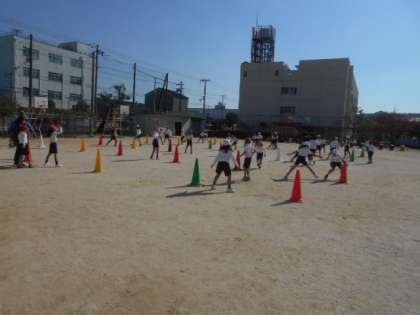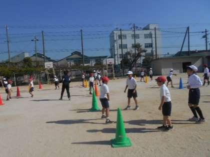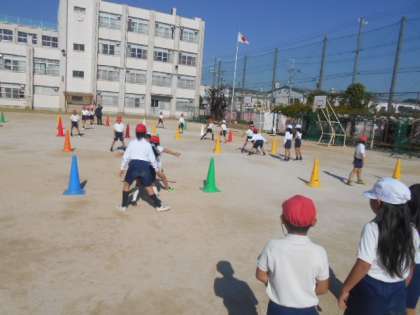 通り抜け鬼ごっこ 公開日 2023/11/22 更新日 2023/11/22 3年 3年生は体育科に時間に「通り抜け鬼ごっこ」に取り組んでいました。攻撃側は、守備側のタッチをかいくぐってゴールしたら点が入ります。攻撃側の一人目が出発して、守備側がその人へ気を取られている間に、攻撃側二人目がすきを見て通り抜けるなど、上手に作戦を立てています。 子どもたちは楽しそうに競技をしていました。 いいね(0)