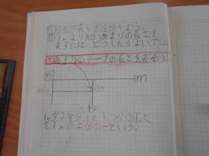 分数の表し方を調べよう 公開日 2023/11/29 更新日 2023/11/29 3年 3年2組では算数科「分数」を学習しています。1mより短いあまりの長さをどのように表せばよいのでしょうか。1mを2等分した1つ分の長さを「二分の一」mということを学びました。 いいね(0)