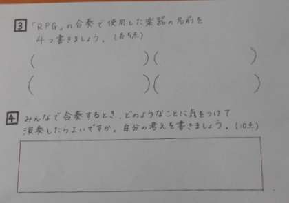 音楽科のテスト 公開日 2023/12/11 更新日 2023/12/11 5年 5年1組では音楽科のテストをしていました。和音の種類、記号の名前や意味、ある曲の階名について問われていました。また、合奏で使用した楽器について、合奏をするときに気をつけることについてももんだいになっていて、音楽発表会でがんばったことが問われていると感じました。 いいね(0)