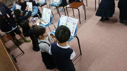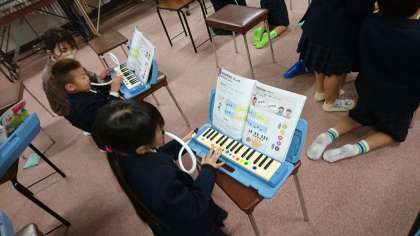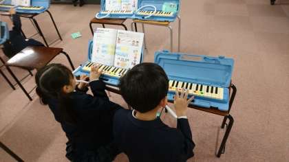鍵盤ハーモニカの練習です。 友達と教え合い、指使いに気をつけてながら弾いていました。