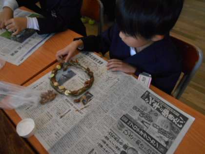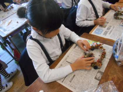 2年 リースづくり 公開日 2023/12/14 更新日 2023/12/14 その他 以前収穫したさつまいものつるを使って、クリスマスリースを作りました。 自分で持ってきたかざりや、どんぐりなど自然のかざりをつけました。 世界に一つだけのかわいいリースの完成です。 いいね(0)