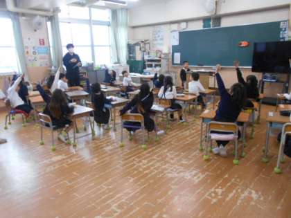 1年2組では国語科「おはなしを かこう」の学習で作ったお話を発表していました。「登場人物」「その人物が得意なことや良いところ」などをワークシートにまとめて、がんばって自分オリジナルのお話を作りました。発表後、先生から「よかったところは?」と問われ、たくさん挙手がありました。