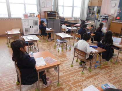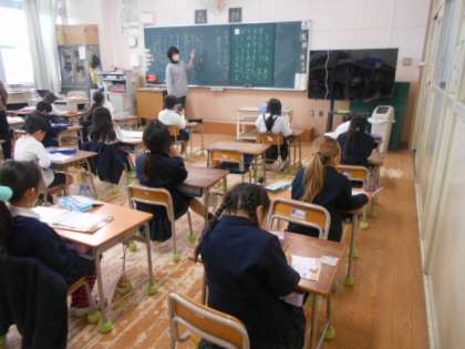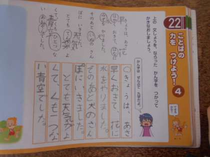 1年1組では国語科の時間に、漢字ドリル「ことばの 力を つけよう」の問題に取り組んでいました。1年生になって、すでにたくさん漢字を学びました。平仮名ばかりの文章を読んで、習っている漢字に置き換えます。知っている漢字は、すべて直せたでしょうか。