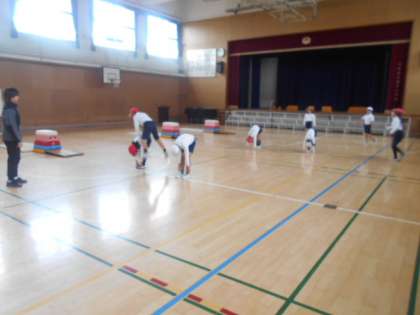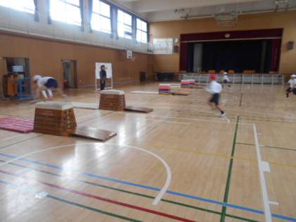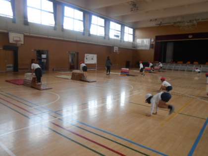 3年2組では体育科の時間に、開脚跳びに取り組んでいました。慣れの運動として、うさぎ跳びや馬跳び、跳び上がり下りを何度もしていました。手を跳び箱につく際は「もみじの手」になるように注意します。事前に十分動いた後、自分の課題である段数の跳び箱の開脚跳びを練習していました。
