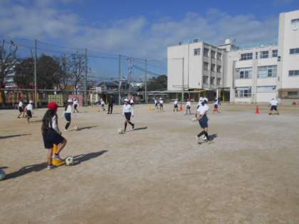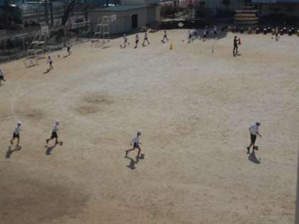 ボール運動 公開日 2024/02/07 更新日 2024/02/07 4年 4年生は体育科の時間に「ボール運動」に取り組みました。まずは、サッカーボールをドリブルしながら、運動場のトラックを周回します。次は、ドリブルしながら先の三角コーンをターンして戻ってきます。ボールを遠くへ蹴り過ぎると追いつくのが大変です。うまくドリブルできたでしょうか。 いいね(0)