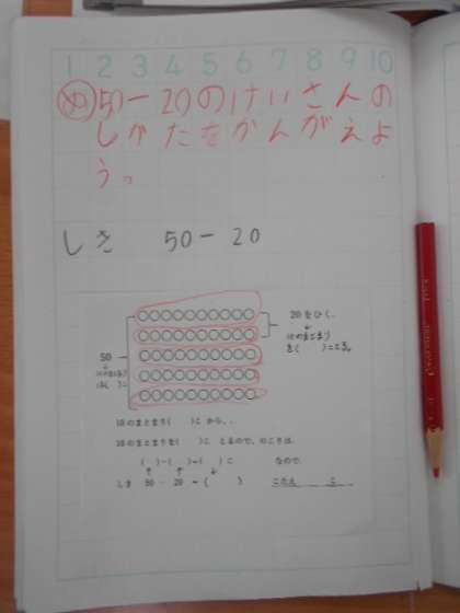 1年2組では算数科「たし算と ひき算」を学習しています。本時では「50−20」の計算の仕方について考えていました。問題文を図でノートに表すと、10ずつのまとまりを赤鉛筆での丸で囲って確実に数えていました。