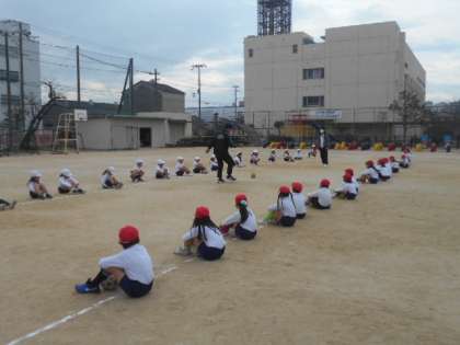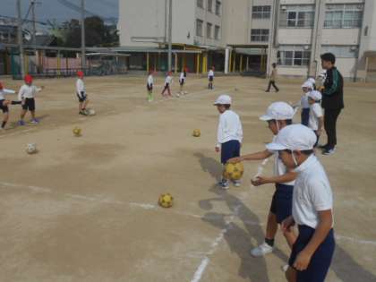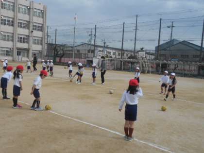 1年生は体育の時間に「ボールけり遊び」に取り組んでいました。2人組で、ボールを蹴り合います。先生からボールを蹴るときの注意、そして、相手が蹴ったボールを受けるときの注意を聞きました。それでは、2人組になって練習を開始しましたが、ボールを思い通りの方向に蹴るのは難しいようです。