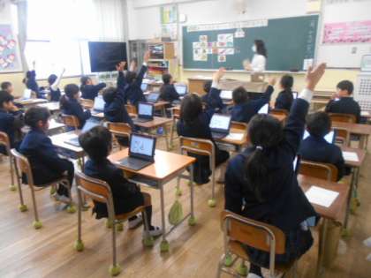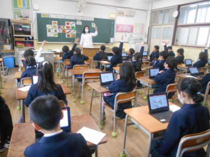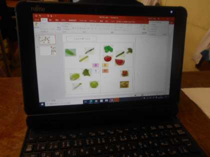 2年生は食に関する指導「食べものの おいしい きせつを 知ろう」に取り組んでいました。タブレットにいろいろな食べ物のカードが載っています。それらを旬が春夏秋冬の季節に分けて、タブレットを操作して分類していきました。